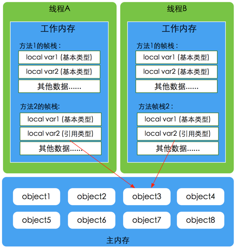 JVM运行程序的实体是线程,而每个线程创建时JVM都会为其创建一个工作内存(即线程栈,也叫虚拟机栈,总之这个空间线程独有),用于存储线程私有数据,而Java内存模型中规定所有变量都存储在主内存,主内存是共享内存区域,所有线程都可以访问,但线程对变量的操作 (读取赋值等) 必须在工作内存中进行!